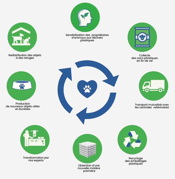 Dès aujourd’hui, Animo Impact organise la collecte des déchets qui alimenteront cette usine, grâce à un partenariat innovant avec un potentiel de 6500 cliniques vétérinaires en France : ces dernières seront équipées de boîtes de dépôt, permettant aux propriétaires d’animaux de déposer leurs emballages de nourriture animale vides. Ces emballages seront ensuite acheminés par la centrale de distribution Centravet vers le centre de recyclage. Ce dernier, après un tri des différents matériaux, recyclera plus de 95% de ces emballages pour les transformer en accessoires pour animaux. Et, afin de mener jusqu’au bout la démarche circulaire, une partie de cette production sera redistribuée gratuitement à des associations de protection animale et à des refuges.