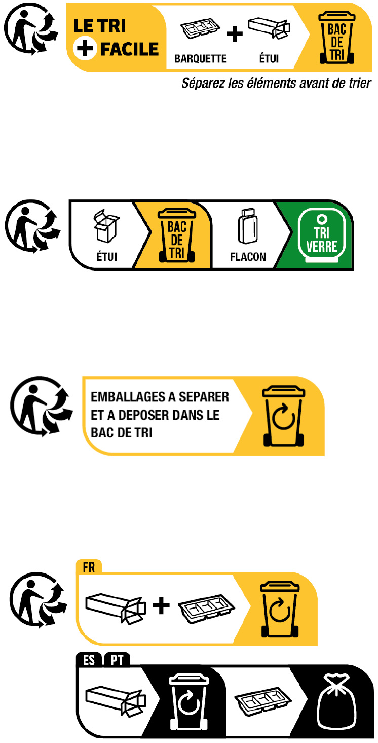 Il est important que l’univers graphique des consignes de tri soit respecté pour faciliter leur identification par les consommateurs, quels que soient les marques et les produits. Toutefois, les metteurs en marché disposent de marges de manœuvre pour adapter le message à leurs produits en fonction de la taille, de la nature et de la couleur de leurs emballages. Plusieurs versions (pictos seuls, texte seul, texte et pictos) sont ainsi proposées, ainsi qu’une option de signalétique « multi-pays ».